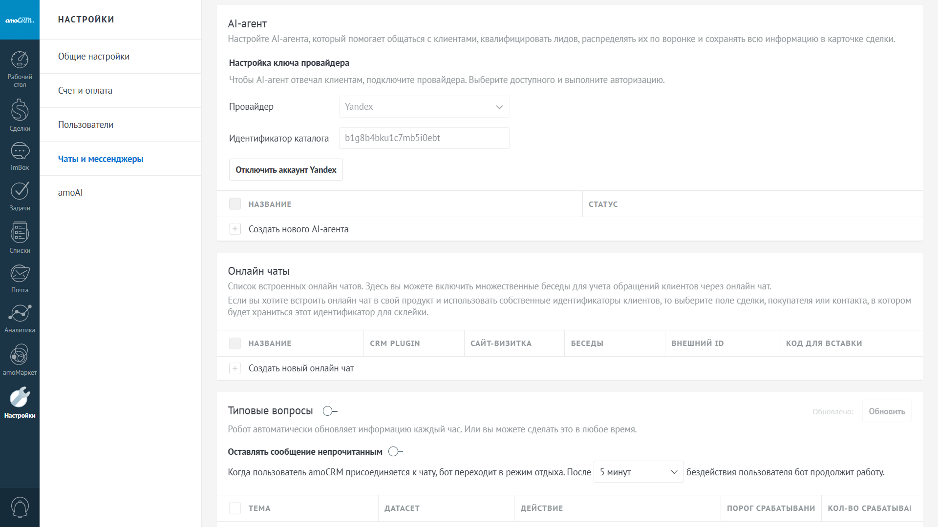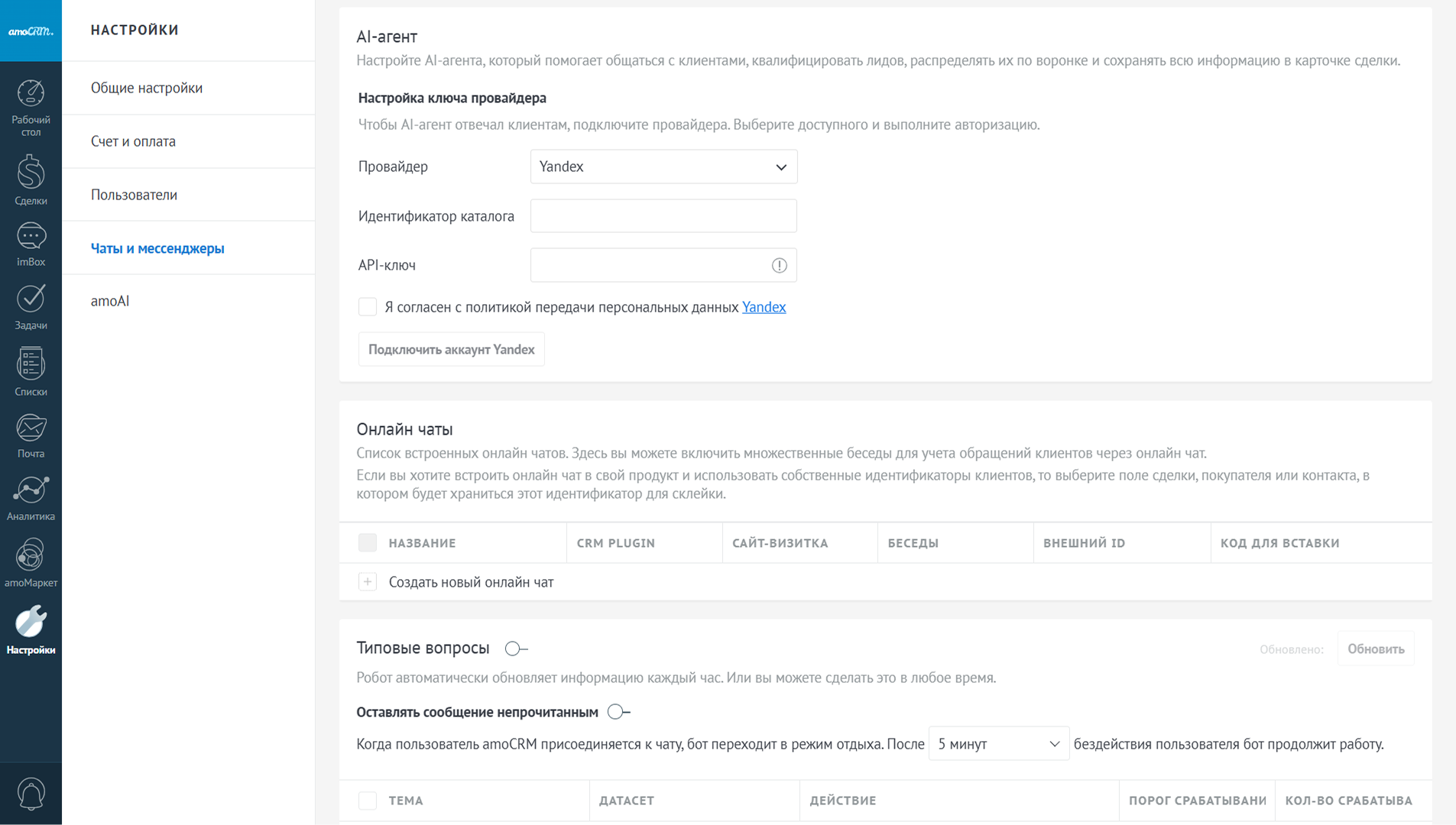 Функционал подключается через раздел “Настройки” - “Чаты и мессенджеры”. Для подключения можно выбрать OpenAI или YandexGPT.