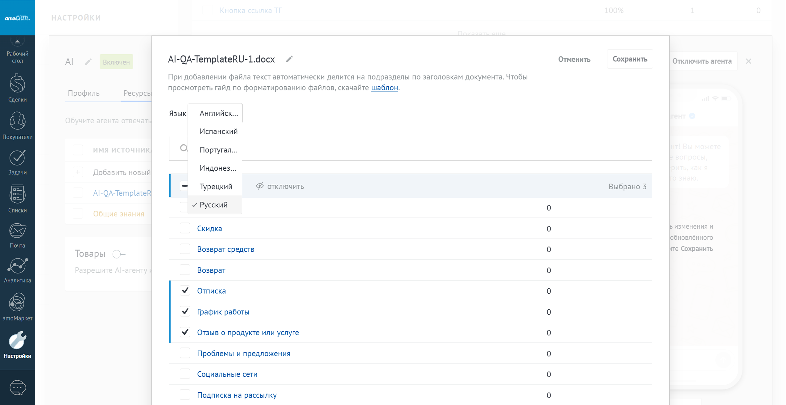 После успешного подключения AI-агента, он отобразится в списке. При клике на название подключенного агента откроется окно его настроек.