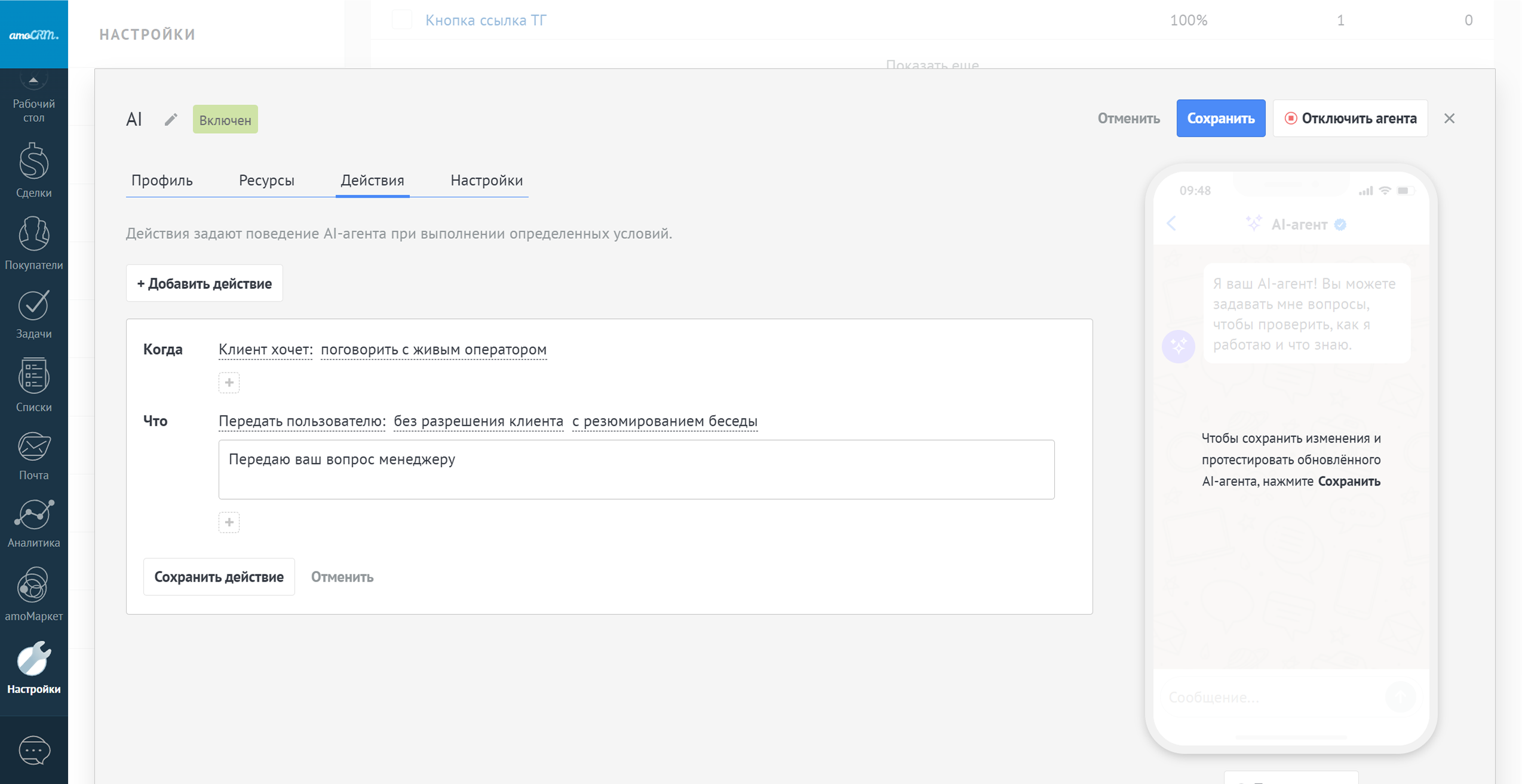 В данном разделе мы можем задать поведение AI-агента при выполнении определенных условий, например - передать вопрос оператору.