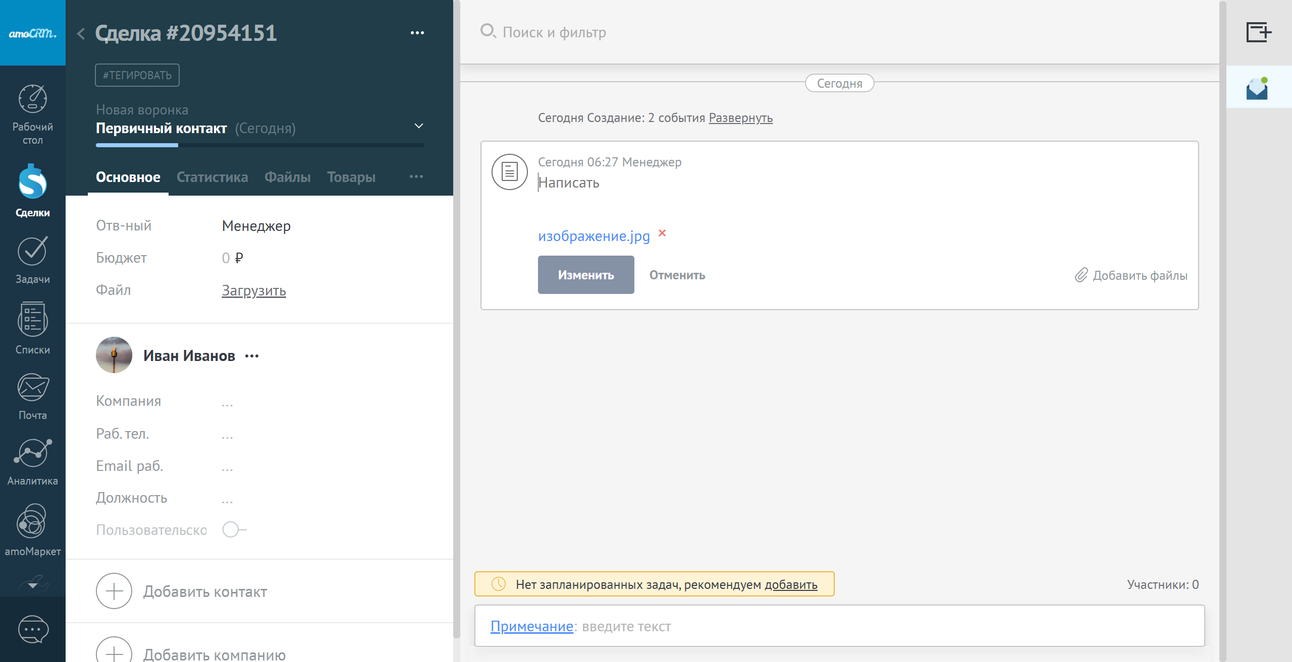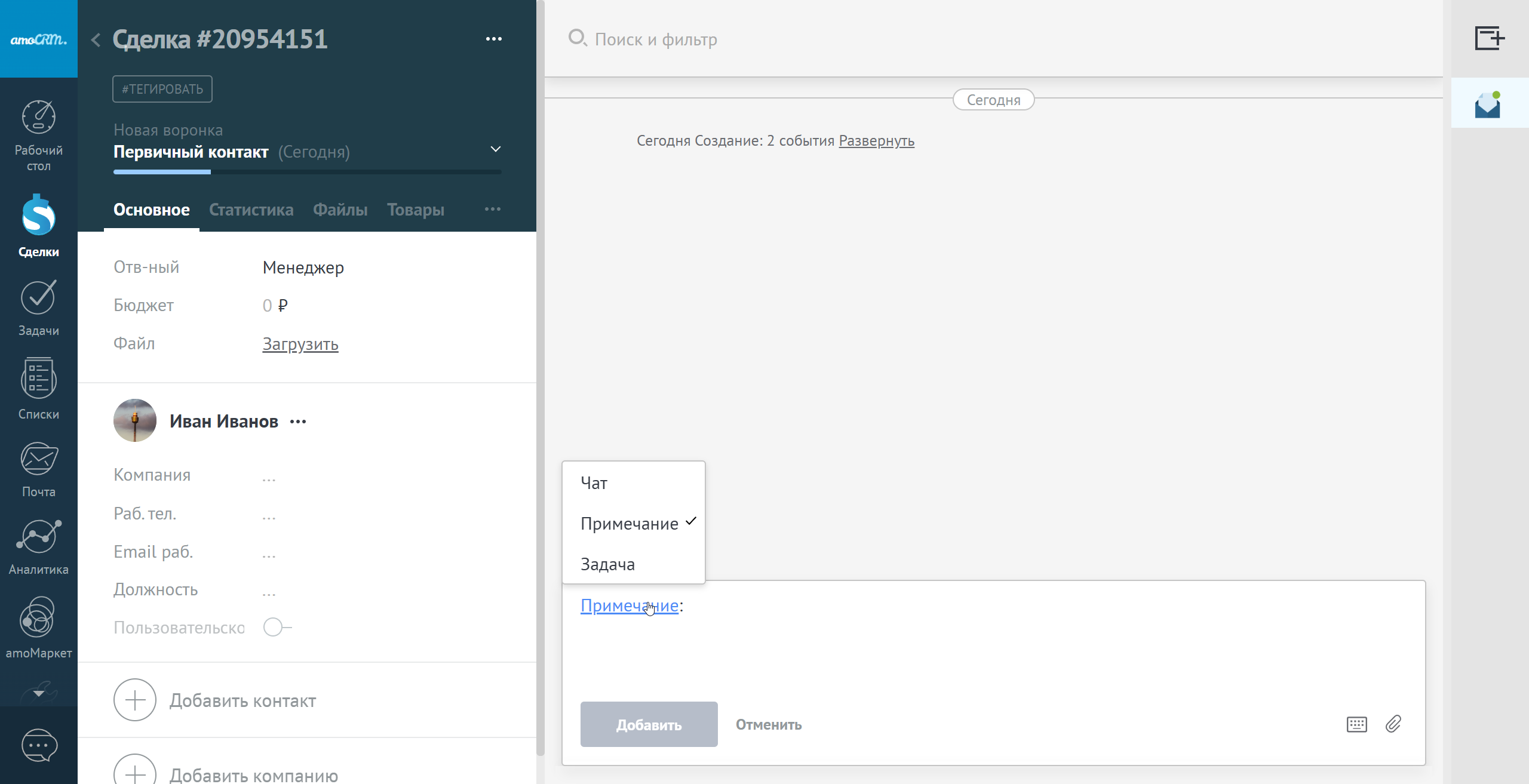 Добавить файл в сделку можно в примечании, внутреннем чате, или чате с клиентом. Для этого в правом нижем углу нужно нажать на значок скрепки - откроется окно с выбором файлов на вашем устройстве. Так же - можно найти нужный вам файл на устройстве и перетащить его в окно примечания, или ввода сообщения - файл будет добавлен.