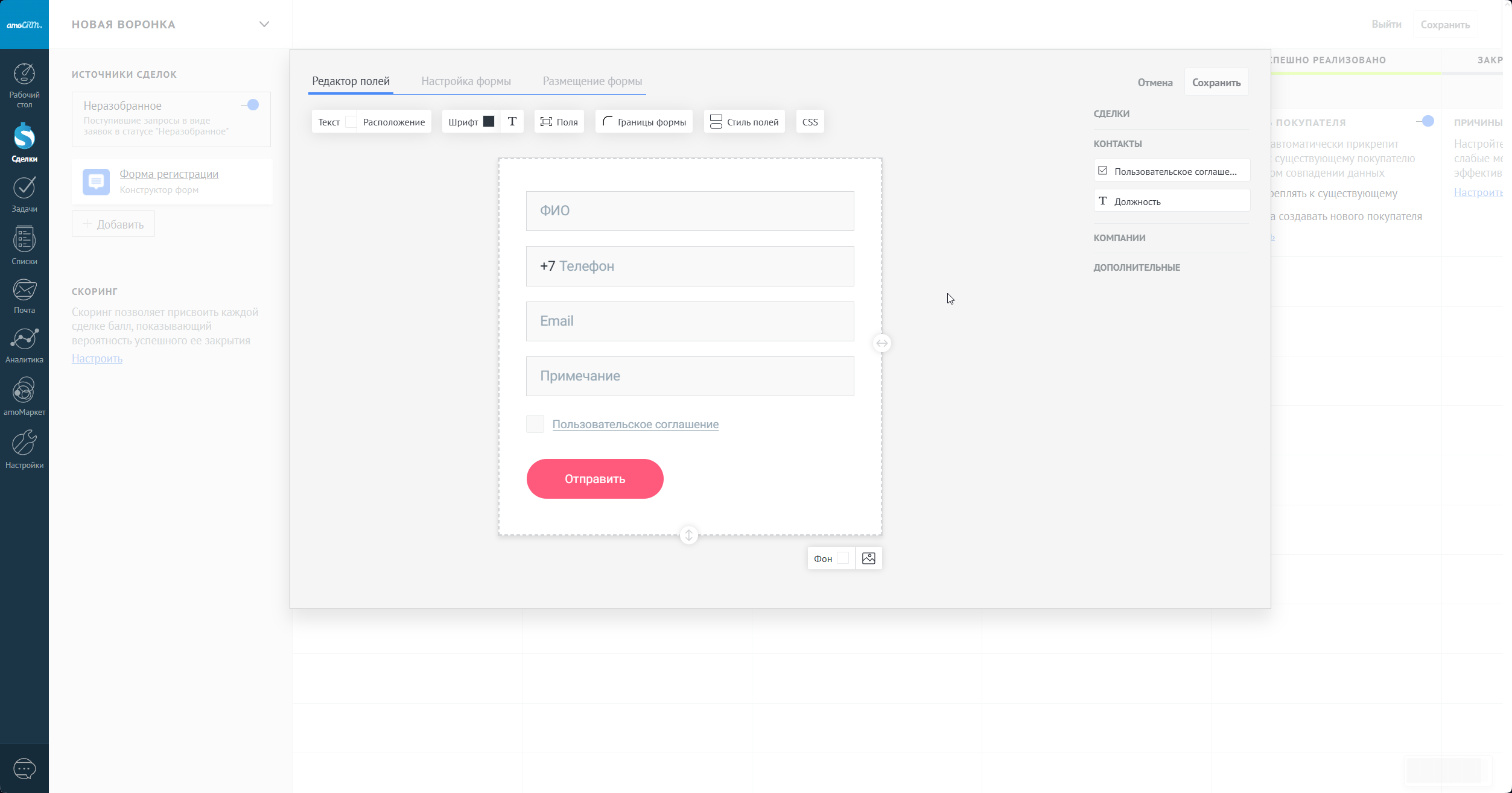 Почти все компании используют форму для сбора заявок на сайте. Наша система позволяет с помощью удобного конструктора создать одну или несколько форм и разместить ее на сайте без помощи программиста. Вы можете настроить так, как вам удобно, выбрать оформление, расположение, а также этап, на который будут приходить заявки.