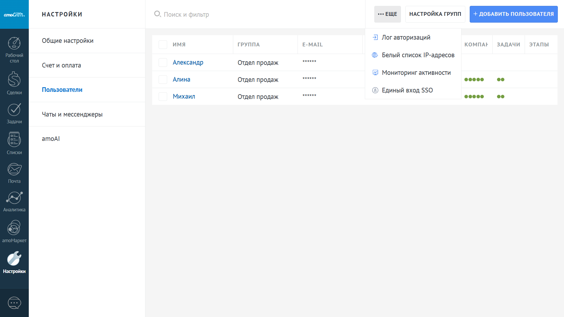 Вы также можете дать администраторский доступ, это значит что пользователь сможет добавлять других пользователей, настраивать аккаунт и подключать сторонние интеграции, доступ к почте, тогда он сможет просматривать все корпоративные ящики, даже если письма не прикреплены к карточке.