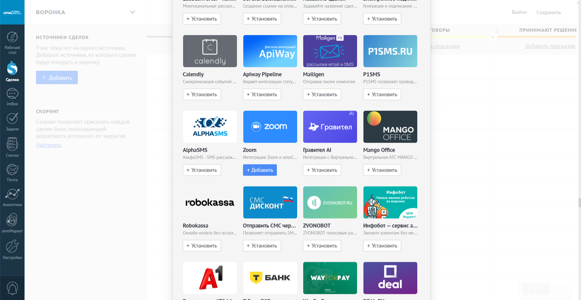 Для подключения интеграции откройте раздел amoМаркет. В поиске введите "Zoom" и нажмите "Установить".