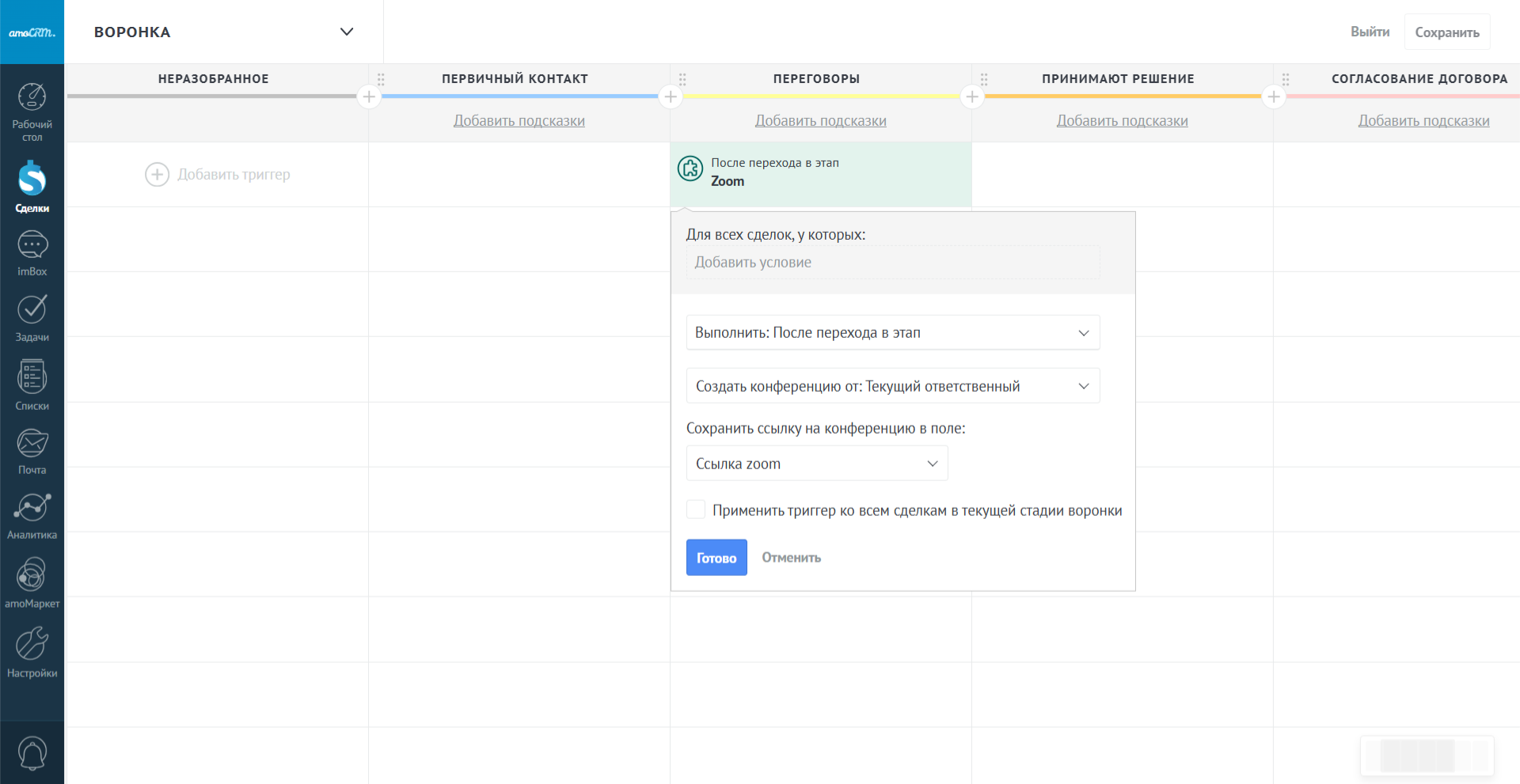Вы можете прямо из карточки сделки создать ссылку на конференцию, отправить ее участникам и сохранить ссылку на запись в истории работы. Также вы можете настроить автоматические триггеры Zoom в Digital-pipeline.